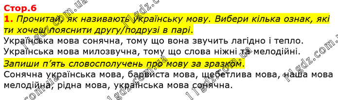 1. Прочитай, як називають українську мову. Вибери кілька ознак, які ти хочеш пояснити другу/подрузі в парі. Українська мова сонячна, тому що вона звучить лагідно і тепло. Українська мова милозвучна, тому що слова ніжні та мелодійні. Запиши п’ять словосполучень про мову за зразком. Сонячна українська мова, барвиста мова, щебетлива мова, наша мова мелодійна, рідна мова, українська мова сонячна.