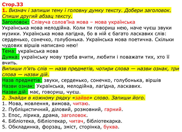 Визнач і запиши тему і головну думку тексту. Добери заголовок. Спиши другий абзац тексту. Заголовок: Співуча солов’їна мова – мова українська Українська мова мелодійна. Коли ти говориш нею, наче чуєш звуки музики. Українська мова лагідна, бо в ній є багато ласкавих слів: серденько, сонечко, голубонька. Українська мова поетична. Скільки чудових віршів написано нею! Тема: українська мова Думка: українську мову треба вчити, любити і поважати тих, хто її вчить. Випиши п’ять слів — назв предметів, чотири слова — назви ознак, три слова — назви дій. Назв предметів: звуки, серденько, сонечко, голубонька, віршів Назви ознак: Українська, мелодійна, лагідна, ласкавих. Назви дій: має, говориш, чуєш. 2. Знайди в кожному рядку «зайве» слово. Запиши його. 1. Мова, мовлення, вимова, читаю. 2. Публіцистичний, діловий, розмовний, гарний. 3. Епос, лірика, драма, заголовок. 4. Бібліотека, бібліотекар, читач, бібліотекарка. 5. Обкладинка, форзац, зміст, сторінка, буква.
