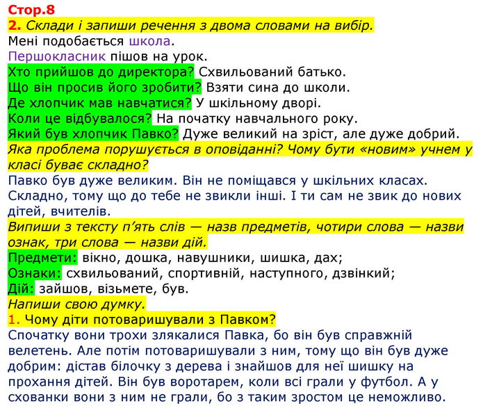 Склади і запиши речення з двома словами на вибір. Мені подобається школа. Першокласник пішов на урок. Хто прийшов до директора? Схвильований батько. Що він просив його зробити? Взяти сина до школи. Де хлопчик мав навчатися? У шкільному дворі. Коли це відбувалося? На початку навчального року. Який був хлопчик Павко? Дуже великий на зріст, але дуже добрий. Яка проблема порушується в оповіданні? Чому бути «новим» учнем у класі буває складно? Павко був дуже великим. Він не поміщався у шкільних класах. Складно, тому що до тебе не звикли інші. І ти сам не звик до нових дітей, вчителів. Випиши з тексту п’ять слів — назв предметів, чотири слова — назви ознак, три слова — назви дій. Предмети: вікно, дошка, навушники, шишка, дах; Ознаки: схвильований, спортивній, наступного, дзвінкий; Дій: зайшов, візьмете, був. Напиши свою думку. 1. Чому діти потоваришували з Павком? Спочатку вони трохи злякалися Павка, бо він був справжній велетень. Але потім потоваришували з ним, тому що він був дуже добрим: дістав білочку з дерева і знайшов для неї шишку на прохання дітей. Він був воротарем, коли всі грали у футбол. А у схованки вони з ним не грали, бо з таким зростом це неможливо.