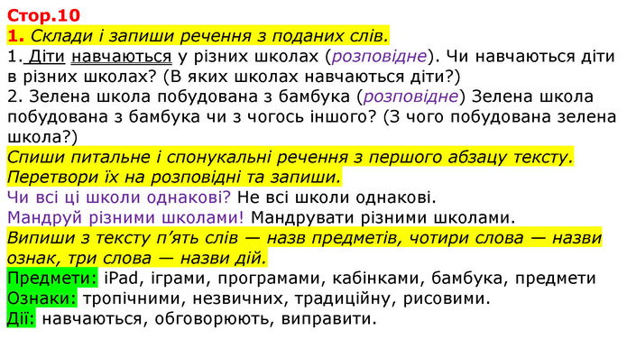 Склади і запиши речення з поданих слів. 1. Діти навчаються у різних школах (розповідне). Чи навчаються діти в різних школах? (В яких школах навчаються діти?) 2. Зелена школа побудована з бамбука (розповідне) Зелена школа побудована з бамбука чи з чогось іншого? (З чого побудована зелена школа?) Спиши питальне і спонукальні речення з першого абзацу тексту. Перетвори їх на розповідні та запиши. Чи всі ці школи однакові? Не всі школи однакові. Мандруй різними школами! Мандрувати різними школами. Випиши з тексту п’ять слів — назв предметів, чотири слова — назви ознак, три слова — назви дій. Предмети: iPad, іграми, програмами, кабінками, бамбука, предмети Ознаки: тропічними, незвичних, традиційну, рисовими. Дії: навчаються, обговорюють, виправити.
