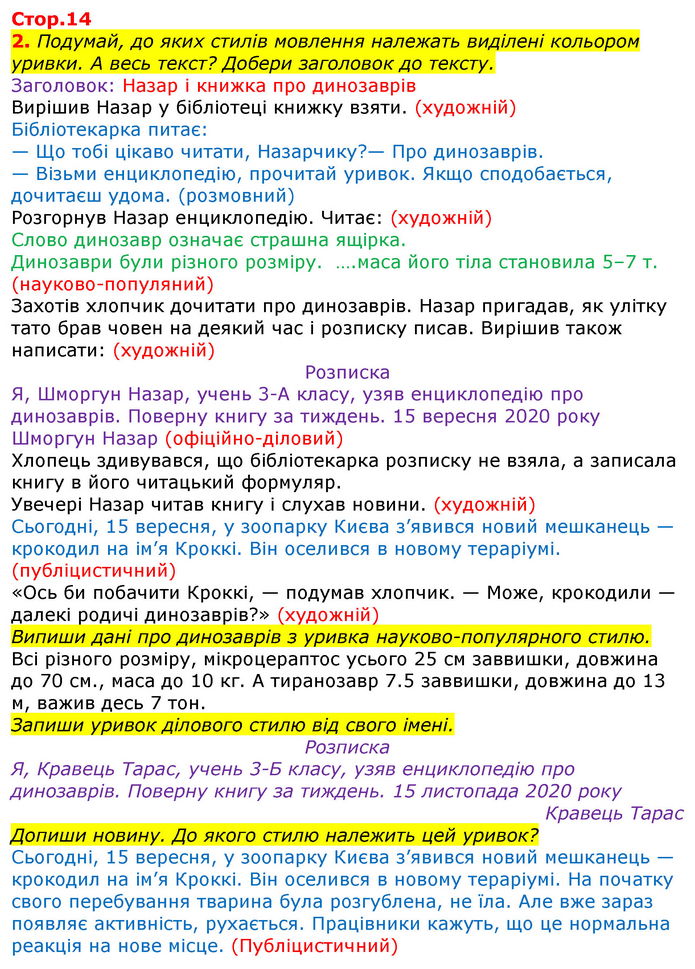Подумай, до яких стилів мовлення належать виділені кольором уривки. А весь текст? Добери заголовок до тексту. Заголовок: Назар і книжка про динозаврів Вирішив Назар у бібліотеці книжку взяти. (художній) Бібліотекарка питає: — Що тобі цікаво читати, Назарчику?— Про динозаврів. — Візьми енциклопедію, прочитай уривок. Якщо сподобається, дочитаєш удома. (розмовний) Розгорнув Назар енциклопедію. Читає: (художній) Слово динозавр означає страшна ящірка. Динозаври були різного розміру. ….маса його тіла становила 5–7 т. (науково-популяний) Захотів хлопчик дочитати про динозаврів. Назар пригадав, як улітку тато брав човен на деякий час і розписку писав. Вирішив також написати: (художній) Розписка Я, Шморгун Назар, учень 3-А класу, узяв енциклопедію про динозаврів. Поверну книгу за тиждень. 15 вересня 2020 року Шморгун Назар (офіційно-діловий) Хлопець здивувався, що бібліотекарка розписку не взяла, а записала книгу в його читацький формуляр. Увечері Назар читав книгу і слухав новини. (художній) Сьогодні, 15 вересня, у зоопарку Києва з’явився новий мешканець — крокодил на ім’я Кроккі. Він оселився в новому тераріумі. (публіцистичний) «Ось би побачити Кроккі, — подумав хлопчик. — Може, крокодили — далекі родичі динозаврів?» (художній) Випиши дані про динозаврів з уривка науково-популярного стилю. Всі різного розміру, мікроцераптос усього 25 см заввишки, довжина до 70 см., маса до 10 кг. А тиранозавр 7.5 заввишки, довжина до 13 м, важив десь 7 тон. Запиши уривок ділового стилю від свого імені. Розписка Я, Кравець Тарас, учень 3-Б класу, узяв енциклопедію про динозаврів. Поверну книгу за тиждень. 15 листопада 2020 року Кравець Тарас Допиши новину. До якого стилю належить цей уривок? Сьогодні, 15 вересня, у зоопарку Києва з’явився новий мешканець — крокодил на ім’я Кроккі. Він оселився в новому тераріумі. На початку свого перебування тварина була розгублена, не їла. Але вже зараз появляє активність, рухається. Працівники кажуть, що це нормальна реакція на нове місце. (Публіцистичний)