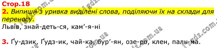 Випиши з уривка виділені слова, поділяючи їх на склади для переносу. Львів, знай-деть-ся, кам’-я-ні 3. Ґу-дзик, Ґудз-ик, чай-ка, бур’-ян, озе-ро, клен, паль-ма.