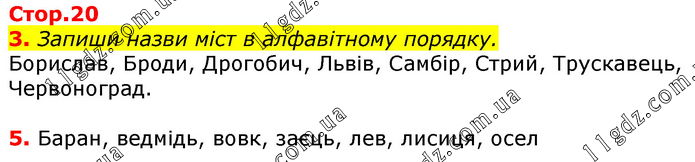 Запиши назви міст в алфавітному порядку. Борислав, Броди, Дрогобич, Львів, Самбір, Стрий, Трускавець, Червоноград. 5. Баран, ведмідь, вовк, заєць, лев, лисиця, осел