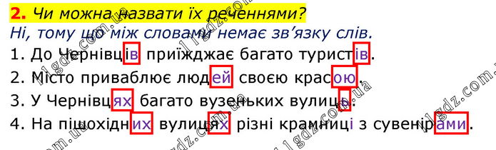 Чи можна назвати їх реченнями? Ні, тому що між словами немає зв’язку слів. 1. До Чернівців приїжджає багато туристів. 2. Місто приваблює людей своєю красою. 3. У Чернівцях багато вузеньких вулиць. 4. На пішохідних вулицях різні крамниці з сувенірами.