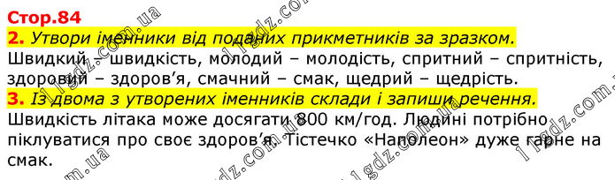 Утвори іменники від поданих прикметників за зразком. Швидкий – швидкість, молодий – молодість, спритний – спритність, здоровий – здоров’я, смачний – смак, щедрий – щедрість. 3. Із двома з утворених іменників склади і запиши речення. Швидкість літака може досягати 800 км/год. Людині потрібно піклуватися про своє здоров’я. Тістечко «Наполеон» дуже гарне на смак.