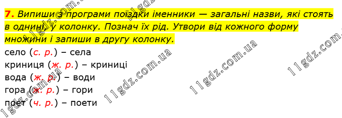Випиши з програми поїздки іменники — загальні назви, які стоять в однині, у колонку. Познач їх рід. Утвори від кожного форму множини і запиши в другу колонку. село (с. р.) – села криниця (ж. р.) – криниці вода (ж. р.) – води гора (ж. р.) – гори поет (ч. р.) – поети