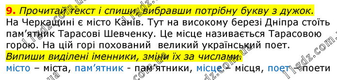 На Черкащині є місто Канів. Тут на високому березі Дніпра стоїть пам’ятник Тарасові Шевченку. Це місце називається Тарасовою горою. На цій горі похований великий український поет. Випиши виділені іменники, зміни їх за числами. місто – міста, пам’ятник - пам’ятники, місце – місця, поет – поети