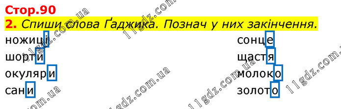 Познач у них закінчення. ножиці шорти окуляри сани сонце щастя молоко золото