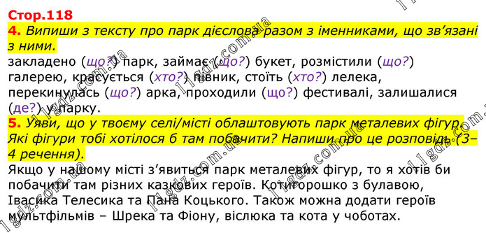 Випиши з тексту про парк дієслова разом з іменниками, що зв’язані з ними. закладено Уяви, що у твоєму селі/місті облаштовують парк металевих фігур. Які фігури тобі хотілося б там побачити? Напиши про це розповідь (3–4 речення).