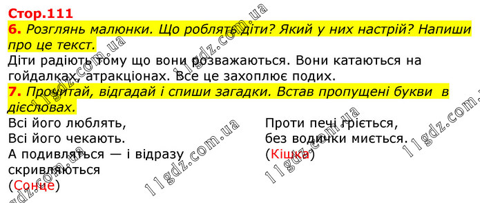 6. Розглянь малюнки. Що роблять діти? Який у них настрій? Напиши про це текст. Діти радіють тому що вони розважаються. Вони катаються на гойдалках, атракціонах. Все це захоплює подих. 7. Прочитай, відгадай і спиши загадки. Встав пропущені букви в дієсловах. Всі його люблять, Всі його чекають. А подивляться — і відразу скривляються (Сонце) Проти печі гріється, без водички миється. (Кішка)