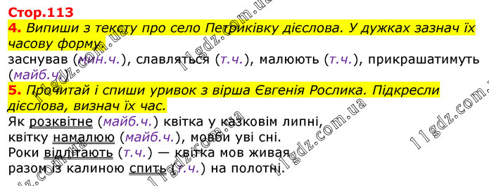 Випиши з тексту про село Петриківку дієслова. У дужках зазнач їх часову форму. Прочитай і спиши уривок з вірша Євгенія Рослика. Підкресли дієслова, визнач їх час.