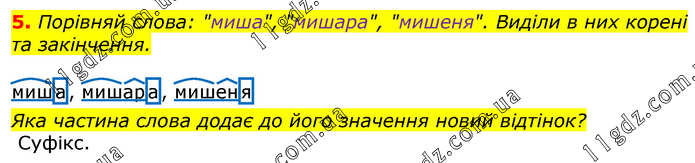 Порівняй слова: "миша", "мишара", "мишеня". Виділи в них корені та закінчення. Яка частина слова додає до його значення новий відтінок?