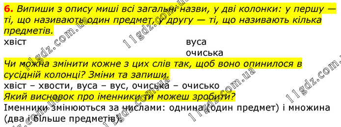 Випиши з опису миші всі загальні назви, у дві колонки: у першу — ті, що називають один предмет, у другу — ті, що називають кілька предметів. Чи можна змінити кожне з цих слів так, щоб воно опинилося в сусідній колонці? Зміни та запиши.