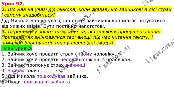 2. Що мав на увазі дід Микола, коли сказав, що зайчикові в лісі страх і самому знадобиться? Дід Микола мав на увазі, що страх зайчикові допомагає рятуватися від хижих звірів. Бути постійно напоготові. 3. Перепиши у зошит план уривка, вставляючи пропущені слова. Пригадай, як змінювалися твої емоції під час читання тексту, і намалюй біля пунктів плану відповідні емоджі. План уривка 1. Зайчик хоче продати страх сивому чоловіку. 2. Зайчик хоче продати невеличкої жінці з чоловіком. 3. Зайчик пропонує страх дівчинці. 4. Зайчик плаче. 5. Дід Микола пошкодував зайчика. 6. Люди пригощали зайчика.