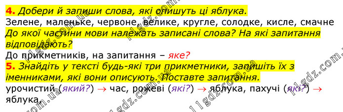 Добери й запиши слова, які опишуть ці яблука. До якої частини мови належать записані слова? На які запитання відповідають? Знайдіть у тексті будь-які три прикметники, запишіть їх з іменниками, які вони описують. Поставте запитання.