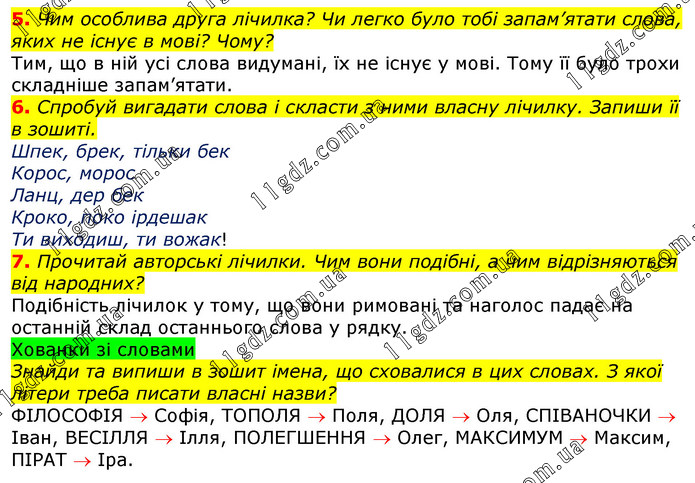 Чим особлива друга лічилка? Чи легко було тобі запам’ятати слова, яких не існує в мові? Чому? Спробуй вигадати слова і скласти з ними власну лічилку. Запиши її в зошиті. Прочитай авторські лічилки. Чим вони подібні, а чим відрізняються від народних? Хованки зі словами Знайди та випиши в зошит імена, що сховалися в цих словах. З якої літери треба писати власні назви? ФІЛОСОФІЯ ТОПОЛЯ ДОЛЯ СПІВАНОЧКИ ВЕСІЛЛЯ ПОЛЕГШЕННЯ МАКСИМУМ ПІРАТ