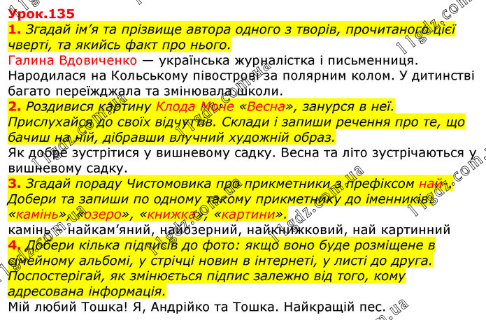 Згадай ім’я та прізвище автора одного з творів, прочитаного цієї чверті, та якийсь факт про нього. Роздивися картину Клода Моне «Весна», занурся в неї. Прислухайся до своїх відчуттів. Склади і запиши речення про те, що бачиш на ній, дібравши влучний художній образ. . Згадай пораду Чистомовика про прикметники з префіксом най-. Добери та запиши по одному такому прикметнику до іменників: «камінь», «озеро», «книжка», «картини». Добери кілька підписів до фото: якщо воно буде розміщене в сімейному альбомі, у стрічці новин в інтернеті, у листі до друга. Поспостерігай, як змінюється підпис залежно від того, кому адресована інформація.