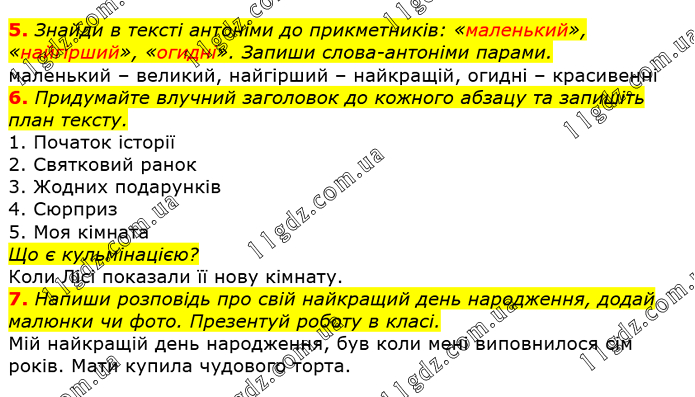 Знайди в тексті антоніми до прикметників: «маленький», «найгірший», «огидні». Запиши слова-антоніми парами. маленький – великий, найгірший – найкращій, огидні – красивенні 6. Придумайте влучний заголовок до кожного абзацу та запишіть план тексту. 1. Початок історії 2. Святковий ранок 3. Жодних подарунків 4. Сюрприз 5. Моя кімната Що є кульмінацією? Коли Лісі показали її нову кімнату. 7. Напиши розповідь про свій найкращий день народження, додай малюнки чи фото. Презентуй роботу в класі. Мій найкращій день народження, був коли мені виповнилося сім років. Мати купила чудового торта.