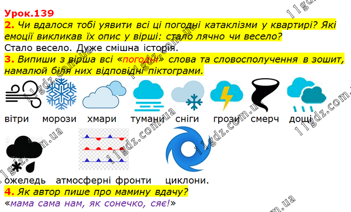 Чи вдалося тобі уявити всі ці погодні катаклізми у квартирі? Які емоції викликав їх опис у вірші: стало лячно чи весело? Випиши з вірша всі «погодні» слова та словосполучення в зошит, намалюй біля них відповідні піктограми. Як автор пише про мамину вдачу?