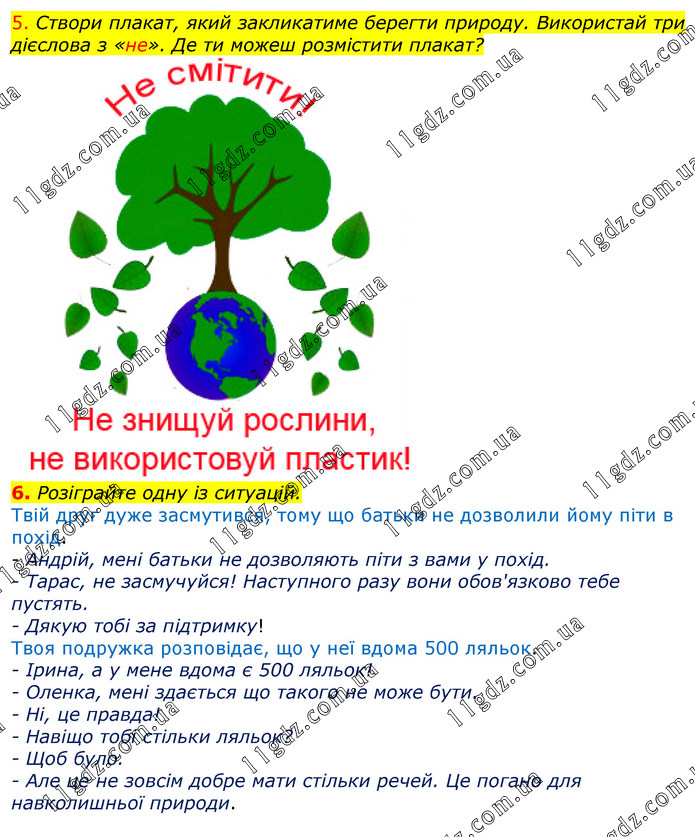 5. Створи плакат, який закликатиме берегти природу. Використай три дієслова з «не». Де ти можеш розмістити плакат? 6. Розіграйте одну із ситуацій. Твій друг дуже засмутився, тому що батьки не дозволили йому піти в похід. - Андрій, мені батьки не дозволяють піти з вами у похід. - Тарас, не засмучуйся! Наступного разу вони обов'язково тебе пустять. - Дякую тобі за підтримку! Твоя подружка розповідає, що у неї вдома 500 ляльок. - Ірина, а у мене вдома є 500 ляльок! - Оленка, мені здається що такого не може бути. - Ні, це правда! - Навіщо тобі стільки ляльок? - Щоб було. - Але це не зовсім добре мати стільки речей. Це погано для навколишньої природи.