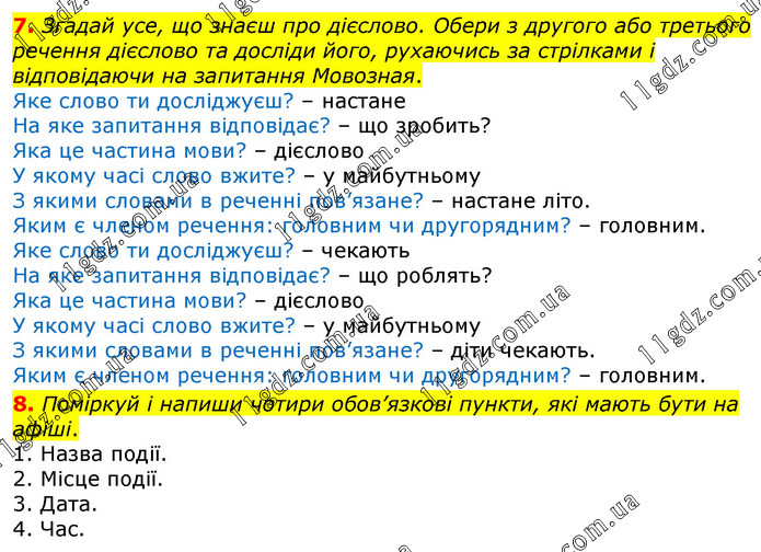 7. Згадай усе, що знаєш про дієслово. Обери з другого або третього речення дієслово та досліди його, рухаючись за стрілками і відповідаючи на запитання Мовозная. Яке слово ти досліджуєш? – настане На яке запитання відповідає? – що зробить? Яка це частина мови? – дієслово У якому часі слово вжите? – у майбутньому З якими словами в реченні пов’язане? – настане літо. Яким є членом речення: головним чи другорядним? – головним. Яке слово ти досліджуєш? – чекають На яке запитання відповідає? – що роблять? Яка це частина мови? – дієслово У якому часі слово вжите? – у майбутньому З якими словами в реченні пов’язане? – діти чекають. Яким є членом речення: головним чи другорядним? – головним. 8. Поміркуй і напиши чотири обов’язкові пункти, які мають бути на афіші. 1. Назва події. 2. Місце події. 3. Дата. 4. Час.