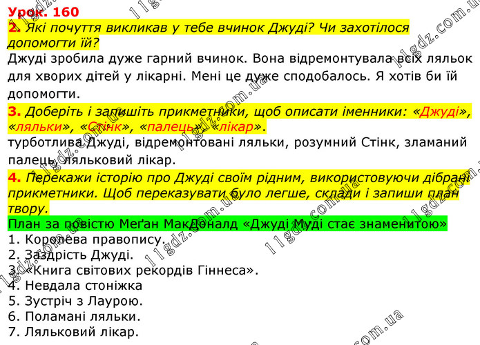 2. Які почуття викликав у тебе вчинок Джуді? Чи захотілося допомогти їй? Джуді зробила дуже гарний вчинок. Вона відремонтувала всіх ляльок для хворих дітей у лікарні. Мені це дуже сподобалось. Я хотів би їй допомогти. 3. Доберіть і запишіть прикметники, щоб описати іменники: «Джуді», «ляльки», «Стінк», «палець», «лікар». турботлива Джуді, відремонтовані ляльки, розумний Стінк, зламаний палець, ляльковий лікар. 4. Перекажи історію про Джуді своїм рідним, використовуючи дібрані прикметники. Щоб переказувати було легше, склади і запиши план твору. План за повістю Меґан МакДоналд «Джуді Муді стає знаменитою» 1. Королева правопису. 2. Заздрість Джуді. 3. «Книга світових рекордів Гіннеса». 4. Невдала стоніжка 5. Зустріч з Лаурою. 6. Поламані ляльки. 7. Ляльковий лікар.