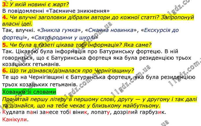 3. У якій новині є жарт? В повідомленні «Таємниче зникнення» 4. Чи влучні заголовки дібрали автори до кожної статті? Запропонуй власні ідеї. Так, влучні. «Зникла гумка», «Смачна новинка», «Екскурсія до фортеці», «Свято родини у школі» 5. Чи була в газеті цікава тобі інформація? Яка саме? Так. Цікавою була інформація про Батуринську фортецю. В ній говориться, що є Батуринська фортеця яка була резиденцією трьох козацьких гетьманів. 6. Що ти дізнався/дізналася про Чернігівщину? Те що на Чернігівщині є Батуринська фортеця, яка була резиденцією трьох козацьких гетьманів. Хованки зі словами Прочитай першу літеру в першому слові, другу — у другому і так далі та дізнайся, що на тебе чекає у близькому майбутньому. Кудлата пані занесе тобі віник, лопату, дозрілий гарбузик. Канікули.
