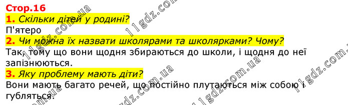Скільки дітей у родині? П'ятеро 2. Чи можна їх назвати школярами та школярками? Чому? Так, тому що вони щодня збираються до школи, і щодня до неї запізнюються. 3. Яку проблему мають діти? Вони мають багато речей, що постійно плутаються між собою і губляться.