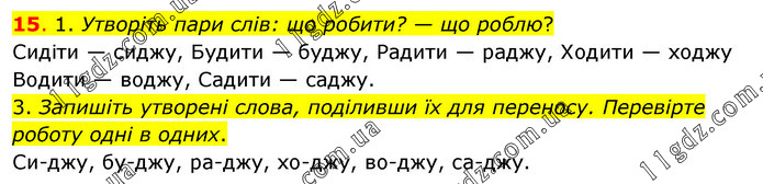 1. Утворіть пари слів: що робити? — що роблю? Сидіти — сиджу, Будити — буджу, Радити — раджу, Ходити — ходжу Водити — воджу, Садити — саджу. 3. Запишіть утворені слова, поділивши їх для переносу. Перевірте роботу одні в одних. Си-джу, бу-джу, ра-джу, хо-джу, во-джу, са-джу.