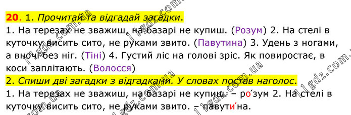 1. Прочитай та відгадай загадки. 1. На терезах не зважиш, на базарі не купиш. (Розум) 2. На стелі в куточку висить сито, не руками звито. (Павутина) 3. Удень з ногами, а вночі без ніг. (Тіні) 4. Густий ліс на голові зріс. Як повиростає, в коси заплітають. (Волосся) 2. Спиши дві загадки з відгадками. У словах постав наголос. 1. На терезах не зважиш, на базарі не купиш. – ро՛зум 2. На стелі в куточку висить сито, не руками звито. – павути՛на.