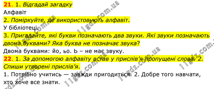21. 1. Відгадай загадку Алфавіт 2. Поміркуйте, де використовують алфавіт. У бібліотеці. 3. Пригадайте, які букви позначають два звуки. Які звуки позначають двома буквами? Яка буква не позначає звука? Двома буквами: йо, ьо. Ь – не має звуку. 22. 1. За допомогою алфавіту встав у прислів’я пропущені слова. 2. Спиши утворені прислів’я. 1. Потрібно учитись — завжди пригодиться. 2. Добре того навчати, хто хоче все знати.