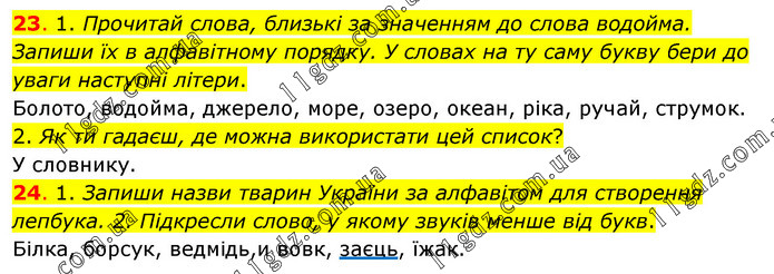 23. 1. Прочитай слова, близькі за значенням до слова водойма. Запиши їх в алфавітному порядку. У словах на ту саму букву бери до уваги наступні літери. Болото, водойма, джерело, море, озеро, океан, ріка, ручай, струмок. 2. Як ти гадаєш, де можна використати цей список? У словнику. 24. 1. Запиши назви тварин України за алфавітом для створення лепбука. 2. Підкресли слово, у якому звуків менше від букв. Білка, борсук, ведмідь,и вовк, заєць, їжак.