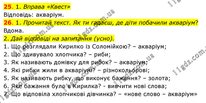 25. 1. Вправа «Квест» Відповідь: акваріум. 26. 1. Прочитай текст. Як ти гадаєш, де діти побачили акваріум? Вдома. 2. Дай відповіді на запитання (усно). 1. Що розглядали Кирилко із Соломійкою? – акваріум; 2. Що здивувало хлопчика? – риби; 3. Як називають домівку для рибок? – акваріум; 4. Які рибки жили в акваріумі? – різнокольорові; 5. Як називають рибку, що виконує бажання? – золота; 6. Яке бажання було в Кирилка? - вивчити нові слова; 7. Що відповіла хлопчикові дівчинка? – «нове слово – акваріум»