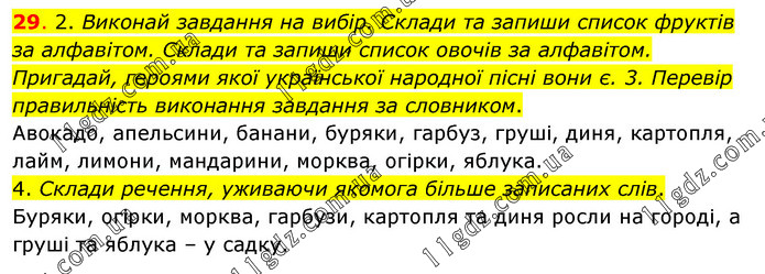2. Виконай завдання на вибір. Склади та запиши список фруктів за алфавітом. Склади та запиши список овочів за алфавітом. Пригадай, героями якої української народної пісні вони є. 3. Перевір правильність виконання завдання за словником. Авокадо, апельсини, банани, буряки, гарбуз, груші, диня, картопля, лайм, лимони, мандарини, морква, огірки, яблука. 4. Склади речення, уживаючи якомога більше записаних слів. Буряки, огірки, морква, гарбузи, картопля та диня росли на городі, а груші та яблука – у садку.
