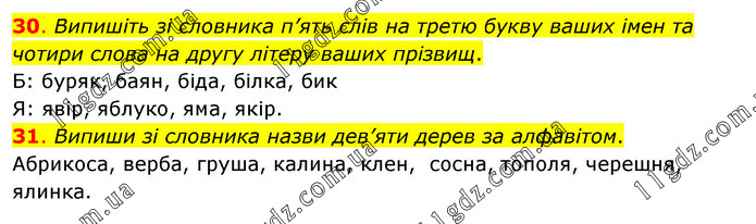30. Випишіть зі словника п’ять слів на третю букву ваших імен та чотири слова на другу літеру ваших прізвищ. Б: буряк, баян, біда, білка, бик Я: явір, яблуко, яма, якір. 31. Випиши зі словника назви дев’яти дерев за алфавітом. Абрикоса, верба, груша, калина, клен, сосна, тополя, черешня, ялинка.