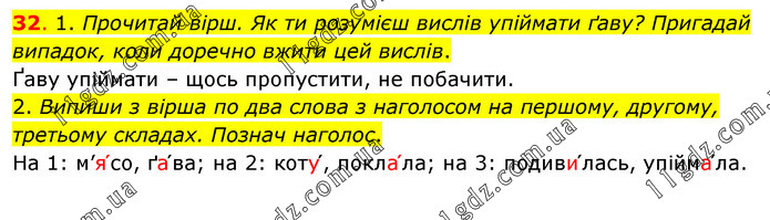 1. Прочитай вірш. Як ти розумієш вислів упіймати ґаву? Пригадай випадок, коли доречно вжити цей вислів. Ґаву упіймати – щось пропустити, не побачити. 2. Випиши з вірша по два слова з наголосом на першому, другому, третьому складах. Познач наголос. На 1: м’я՛со, ґа՛ва; на 2: коту՛, покла՛ла; на 3: подиви՛лась, упійма՛ла.