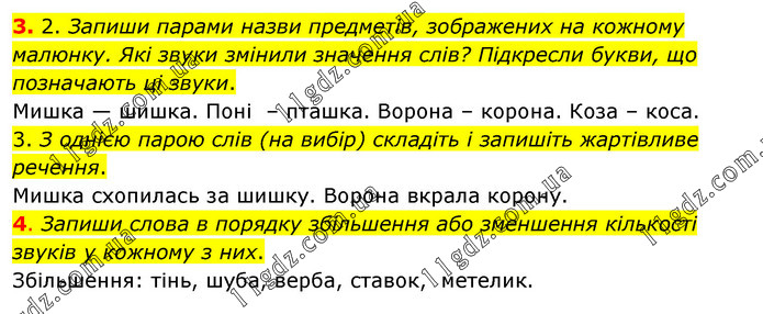 3. 2. Запиши парами назви предметів, зображених на кожному малюнку. Які звуки змінили значення слів? Підкресли букви, що позначають ці звуки. Мишка — шишка. Поні – пташка. Ворона – корона. Коза – коса. 3. З однією парою слів (на вибір) складіть і запишіть жартівливе речення. Мишка схопилась за шишку. Ворона вкрала корону. 4. Запиши слова в порядку збільшення або зменшення кількості звуків у кожному з них. Збільшення: тінь, шуба, верба, ставок, метелик.