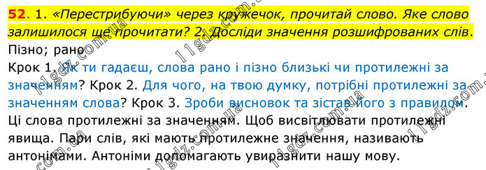 52. 1. «Перестрибуючи» через кружечок, прочитай слово. Яке слово залишилося ще прочитати? 2. Досліди значення розшифрованих слів. Пізно; рано Крок 1. Як ти гадаєш, слова рано і пізно близькі чи протилежні за значенням? Крок 2. Для чого, на твою думку, потрібні протилежні за значенням слова? Крок 3. Зроби висновок та зістав його з правилом. Ці слова протилежні за значенням. Щоб висвітлювати протилежні явища. Пари слів, які мають протилежне значення, називають антонімами. Антоніми допомагають увиразнити нашу мову.