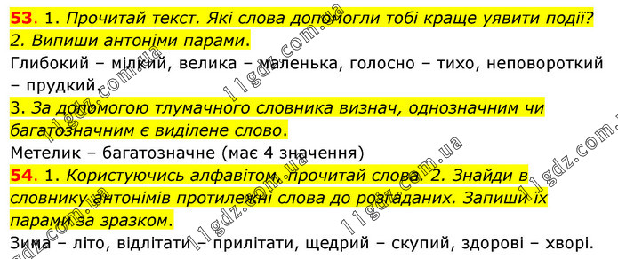 53. 1. Прочитай текст. Які слова допомогли тобі краще уявити події? 2. Випиши антоніми парами. Глибокий – мілкий, велика – маленька, голосно – тихо, неповороткий – прудкий. 3. За допомогою тлумачного словника визнач, однозначним чи багатозначним є виділене слово. Метелик – багатозначне (має 4 значення) 54. 1. Користуючись алфавітом, прочитай слова. 2. Знайди в словнику антонімів протилежні слова до розгаданих. Запиши їх парами за зразком. Зима – літо, відлітати – прилітати, щедрий – скупий, здорові – хворі.