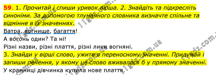 59. 1. Прочитай і спиши уривок вірша. 2. Знайдіть та підкресліть синоніми. За допомогою тлумачного словника визначте спільне та відмінне в їх значеннях. Ватра, вогнище, багаття! А вогонь один? Та ні! Різні назви, різні плаття, різні лики вогняні. 3. Знайди у вірші слово, ужите в переносному значенні. Придумай і запиши речення, у якому це слово вживалося б у прямому значенні. У крамниці дівчинка купила нове плаття.