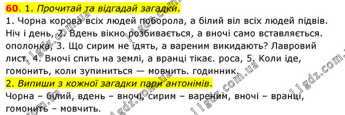 1. Прочитай та відгадай загадки. 1. Чорна корова всіх людей поборола, а білий віл всіх людей підвів. Ніч і день, 2. Вдень вікно розбивається, а вночі само вставляється. ополонка, 3. Що сирим не їдять, а вареним викидають? Лавровий лист. 4. Вночі спить на землі, а вранці тікає. роса, 5. Коли іде, гомонить, коли зупиниться — мовчить. годинник. 2. Випиши з кожної загадки пари антонімів. Чорна – білий, вдень – вночі, сирим – вареним, вночі – вранці, гомонить – мовчить.