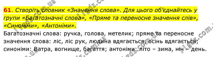 Створіть словник «Значення слова». Для цього об’єднайтесь у групи «Багатозначні слова», «Пряме та переносне значення слів», «Синоніми», «Антоніми». Багатозначні слова: ручка, голова, метелик; пряме та переносне значення слова: ліс, ліс рук, людина вдягається, осінь вдягається; синоніми: Ватра, вогнище, багаття; антоніми: літо – зима, ніч – день.
