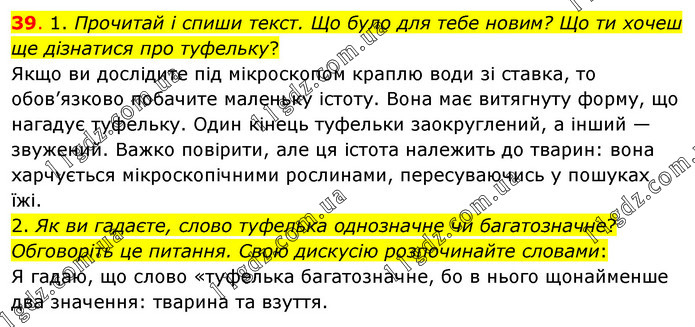 1. Прочитай і спиши текст. Що було для тебе новим? Що ти хочеш ще дізнатися про туфельку? Якщо ви дослідите під мікроскопом краплю води зі ставка, то обов’язково побачите маленьку істоту. Вона має витягнуту форму, що нагадує туфельку. Один кінець туфельки заокруглений, а інший — звужений. Важко повірити, але ця істота належить до тварин: вона харчується мікроскопічними рослинами, пересуваючись у пошуках їжі. 2. Як ви гадаєте, слово туфелька однозначне чи багатозначне? Обговоріть це питання. Свою дискусію розпочинайте словами: Я гадаю, що слово «туфелька багатозначне, бо в нього щонайменше два значення: тварина та взуття.
