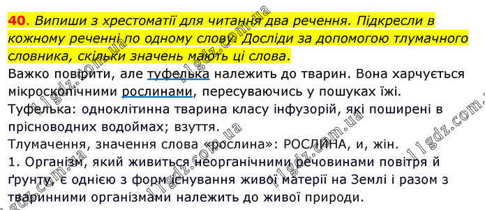Випиши з хрестоматії для читання два речення. Підкресли в кожному реченні по одному слову. Досліди за допомогою тлумачного словника, скільки значень мають ці слова. Важко повірити, але туфелька належить до тварин. Вона харчується мікроскопічними рослинами, пересуваючись у пошуках їжі. Туфелька: одноклітинна тварина класу інфузорій, які поширені в прісноводних водоймах; взуття. Тлумачення, значення слова «рослина»: РОСЛИ́НА, и, жін. 1. Організм, який живиться неорганічними речовинами повітря й ґрунту, є однією з форм існування живої матерії на Землі і разом з тваринними організмами належить до живої природи.