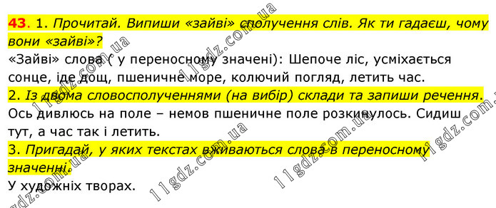 1. Прочитай. Випиши «зайві» сполучення слів. Як ти гадаєш, чому вони «зайві»? «Зайві» слова ( у переносному значені): Шепоче ліс, усміхається сонце, іде дощ, пшеничне море, колючий погляд, летить час. 2. Із двома словосполученнями (на вибір) склади та запиши речення. Ось дивлюсь на поле – немов пшеничне поле розкинулось. Сидиш тут, а час так і летить. 3. Пригадай, у яких текстах вживаються слова в переносному значенні. У художніх творах.