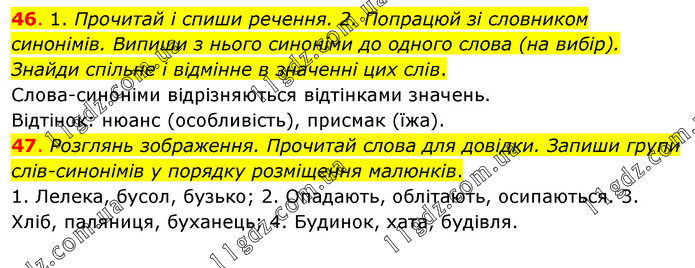 46. 1. Прочитай і спиши речення. 2. Попрацюй зі словником синонімів. Випиши з нього синоніми до одного слова (на вибір). Знайди спільне і відмінне в значенні цих слів. Слова-синоніми відрізняються відтінками значень. Відтінок: нюанс (особливість), присмак (їжа). 47. Розглянь зображення. Прочитай слова для довідки. Запиши групи слів-синонімів у порядку розміщення малюнків. 1. Лелека, бусол, бузько; 2. Опадають, облітають, осипаються. 3. Хліб, паляниця, буханець; 4. Будинок, хата, будівля.