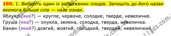 1. Виберіть один із зображених плодів. Запишіть до його назви якомога більше слів — назв ознак. Яблуко (яке?) — кругле, червоне, солодке, тверде, невеличке. Груша (яка?) — опукла, зелена, солодка, тверда, невеличка. Банан (який?) довгий, жовтий, солодкий, твердий, невеличкий.