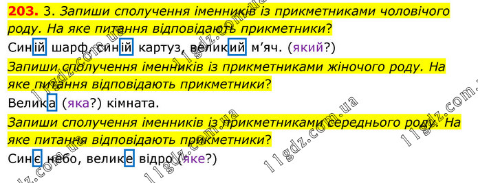 3. Запиши сполучення іменників із прикметниками чоловічого роду. На яке питання відповідають прикметники? Синій шарф, синій картуз, великий м’яч. (який?) Запиши сполучення іменників із прикметниками жіночого роду. На яке питання відповідають прикметники? Велика (яка?) кімната. Запиши сполучення іменників із прикметниками середнього роду. На яке питання відповідають прикметники? Синє небо, велике відро (яке?).
