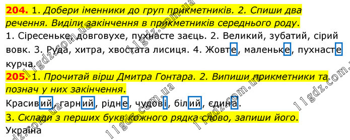 204. 1. Добери іменники до груп прикметників. 2. Спиши два речення. Виділи закінчення в прикметників середнього роду. 1. Сіресеньке, довговухе, пухнасте заєць. 2. Великий, зубатий, сірий вовк. 3. Руда, хитра, хвостата лисиця. 4. Жовте, маленьке, пухнасте курча. 205. 1. Прочитай вірш Дмитра Гонтара. 2. Випиши прикметники та познач у них закінчення. Красивий, гарний, рідне, чудові, білий, єдина. 3. Склади з перших букв кожного рядка слово, запиши його. Україна