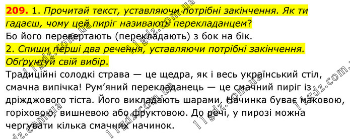 1. Прочитай текст, уставляючи потрібні закінчення. Як ти гадаєш, чому цей пиріг називають перекладанцем? Бо його перевертають (перекладають) з бок на бік. 2. Спиши перші два речення, уставляючи потрібні закінчення. Обґрунтуй свій вибір. Традиційні солодкі страва — це щедра, як і весь український стіл, смачна випічка! Рум’яний перекладанець — це смачний пиріг із дріжджового тіста. Його викладають шарами. Начинка буває маковою, горіховою, вишневою або фруктовою. До речі, у пирозі можна чергувати кілька смачних начинок.
